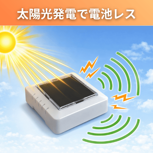 センサは太陽光によって発電した微弱な電流を使って電波を飛ばしています。そのため、定期的な電池交換が不要で、担当者様にも地球にも優しくなっております。