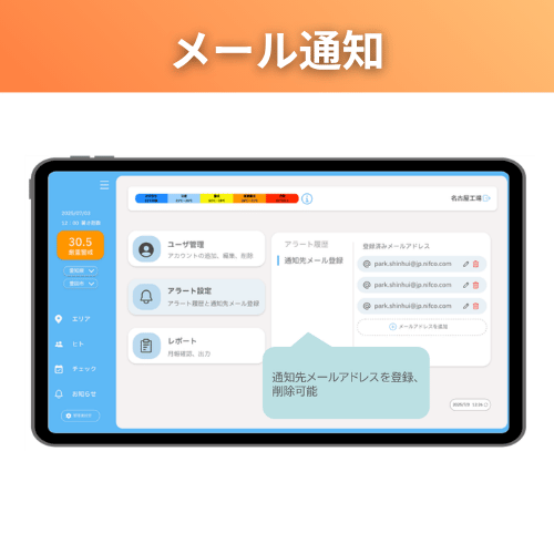 メールアドレスを登録することで、センサーを設置した場所が、閾値を超えたタイミングで通知できる機能があります。これにより、危険と分かったタイミングで即座の対応が可能になります。
