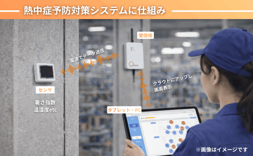 熱中症予防対策システムは、工場や物流倉庫の各所に設置したセンサーから暑さ指数(WBGT)、温度、湿度などの情報を自動で取得し、