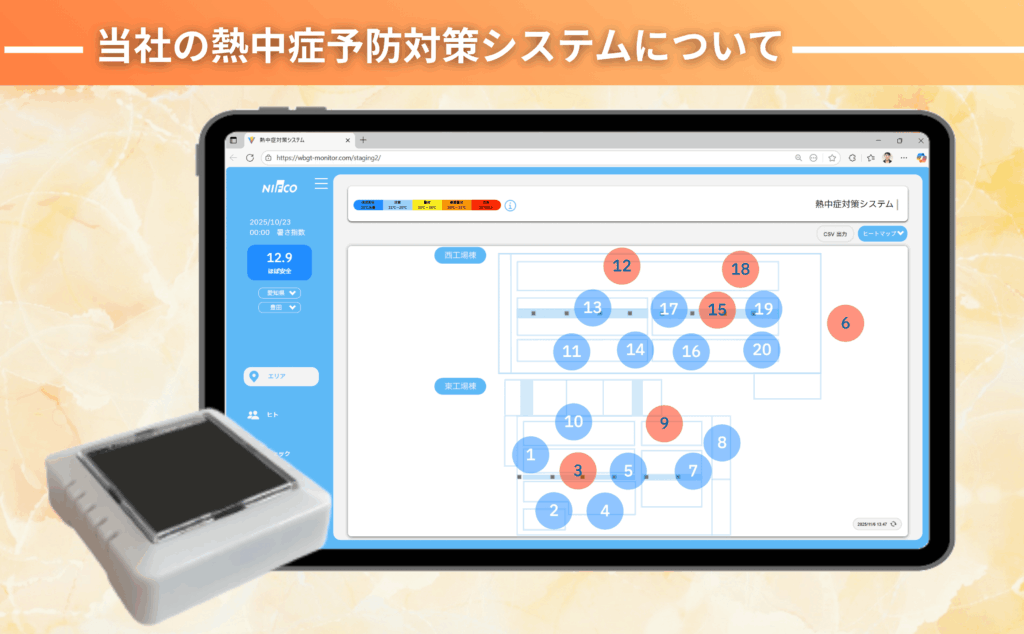 現場の危険度をリアルタイムで見える化する熱中症対策IoTシステムです。
